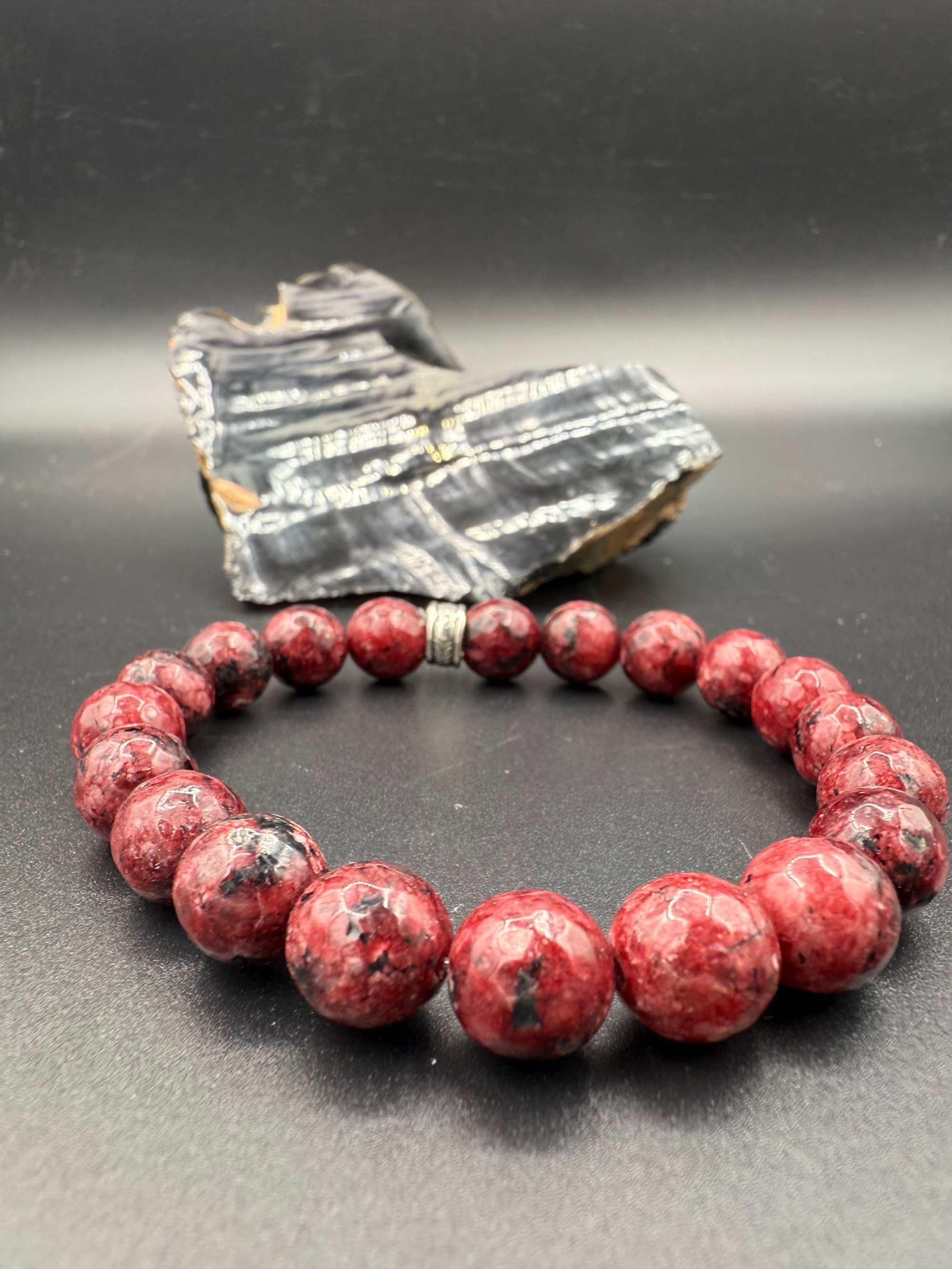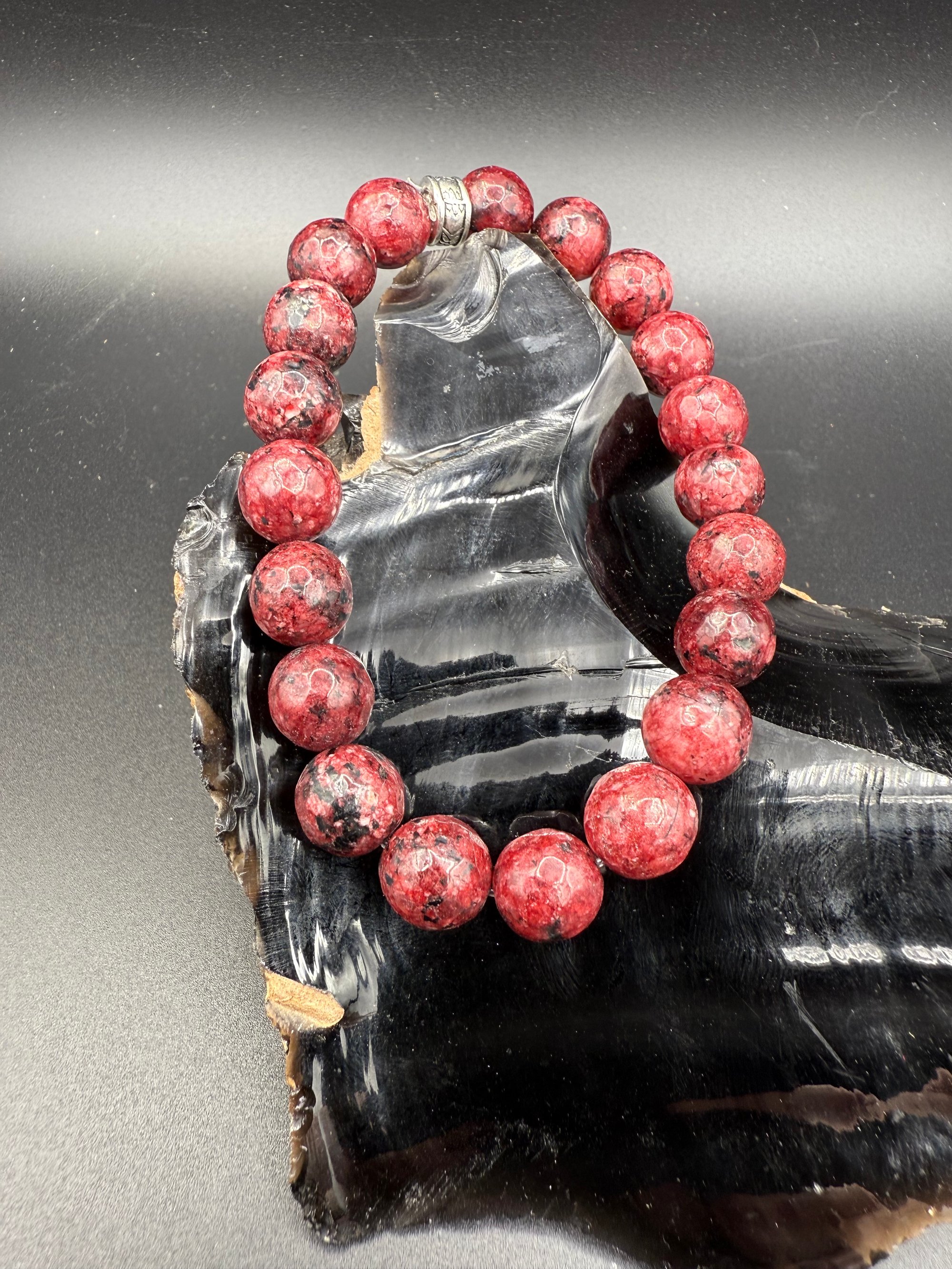 Here we have a lovely 10 mm faceted beaded bracelet made from a dyed Jade material. I typically try to stay away from color, enhanced or man-made materials for the most part, but there are a few exceptions. These beads were just too pretty to pass up! This particular bracelet is a size 7 1/4 inches, which is a bit larger than I normally make. But for reference, my wrist is the size 6 1/4, and this bracelet still fits me pretty well. It is made with a 1 mm pre-stretched stretch cord to prevent sagging, and a nickel-free knot cover.
