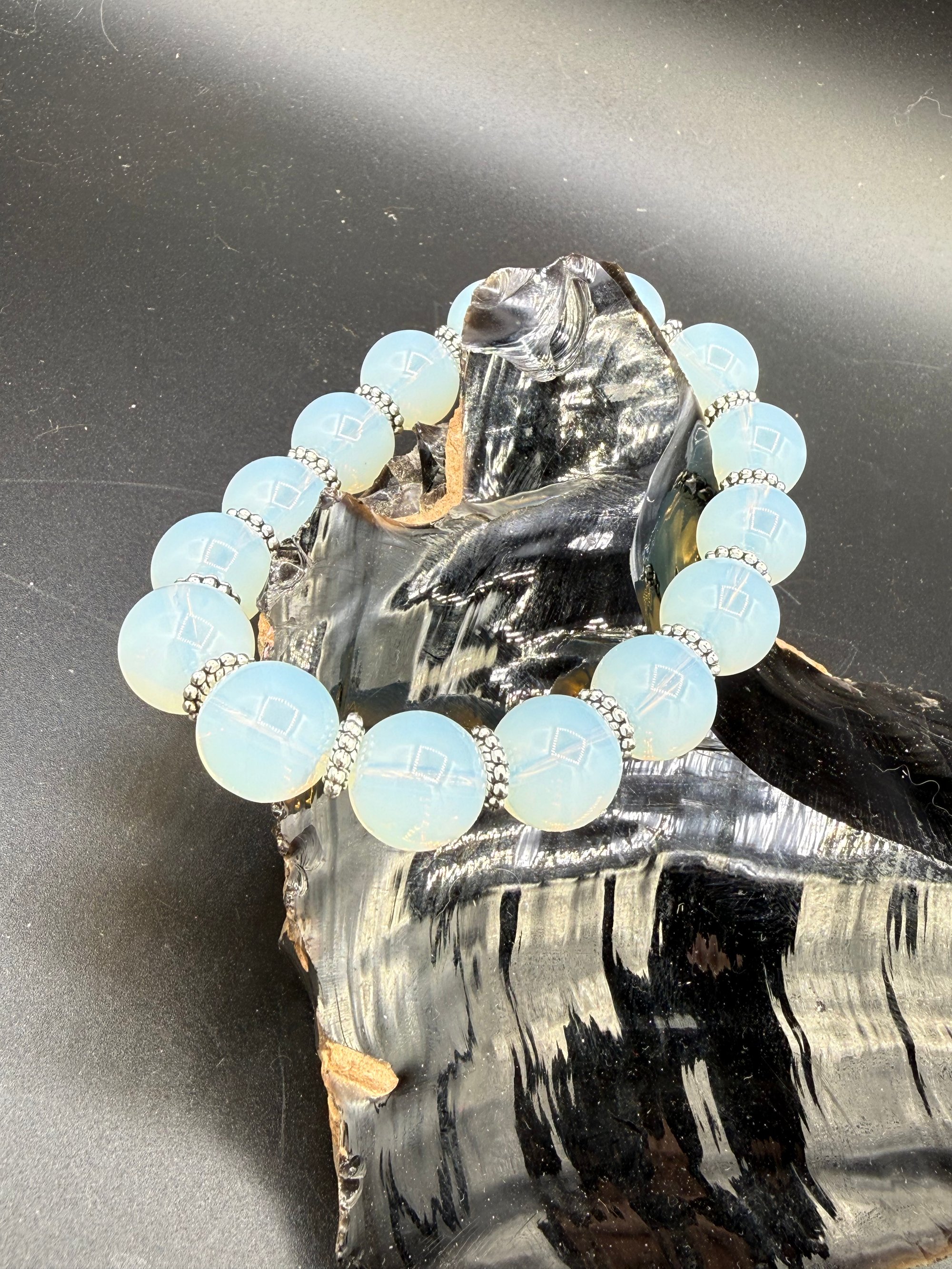 Here we have a 12mm opalite stretch bracelet. I love larger beaded bracelets, and I try to get the larger ones whenever I can. Opalite is a popular synthetic, man-made glass resin designed to mimic natural opal and moonstone.