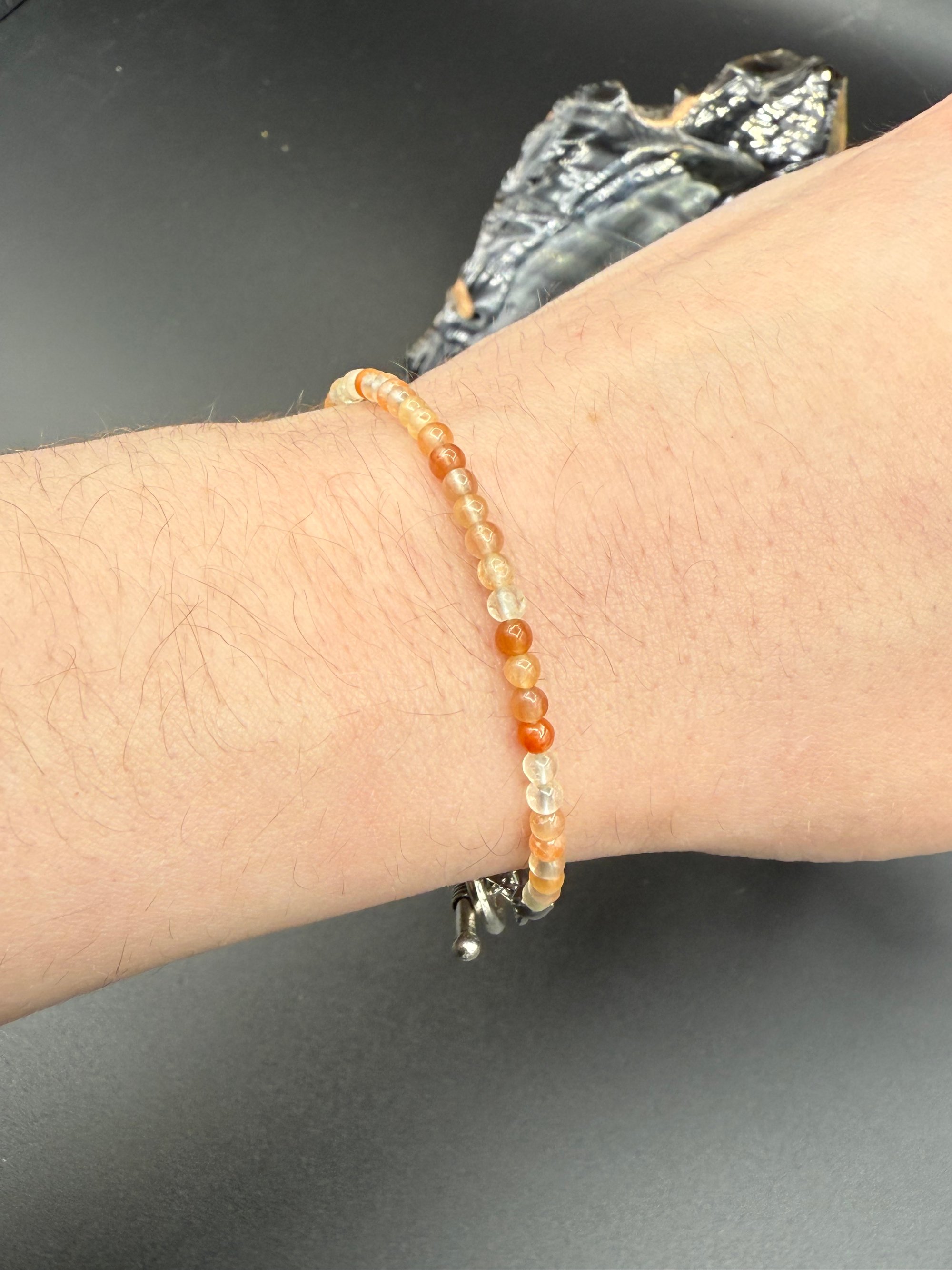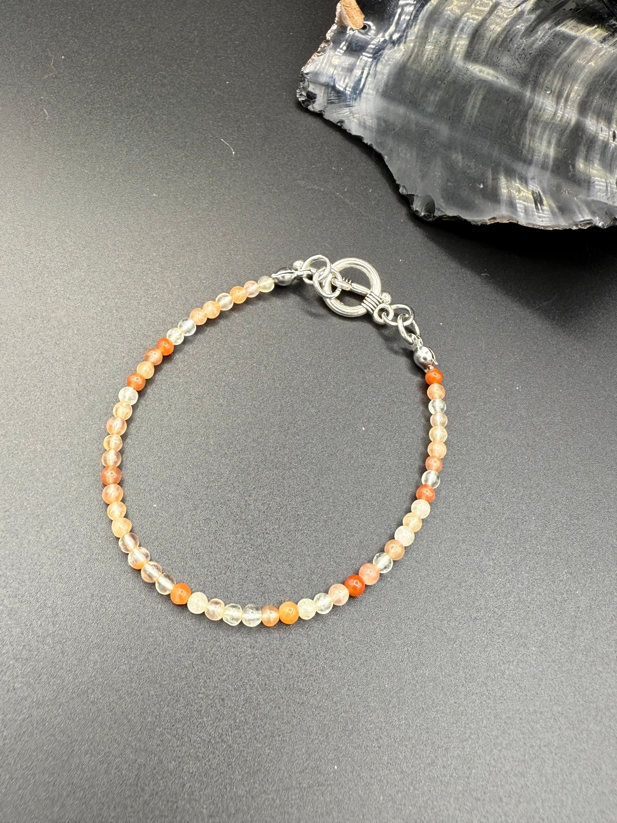 This is a beautiful orangey sunstone bracelet in very dainty 2mm size. These were very hard to string. I like the variation in color on this. The toggle is simple but not adjustable. The bracelet is a size 6 3/4in.