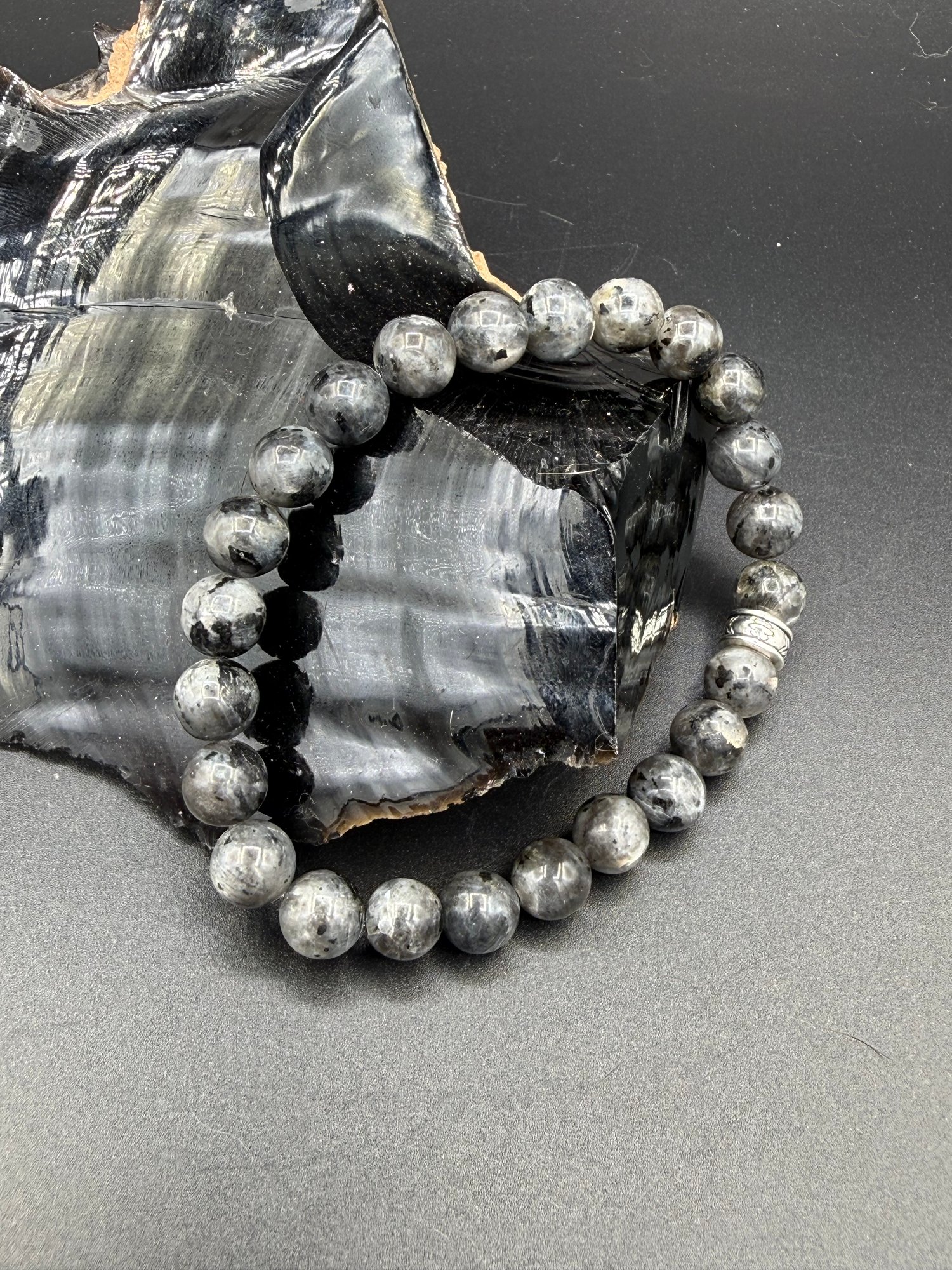 Here we have an 8mm Larvakite bracelet. This material is also sometimes known as black labradorite. It is the same kind of material as lab and rainbow moonstone (and peach moonstone.. and black moonstone..). It is a feldspar with a very specific type of formation and cleavage. The reason labradorite is so much more expensive is literally only the coloring. Larvakite is generally a white or light blue flash, but more typically the whites than the blues.