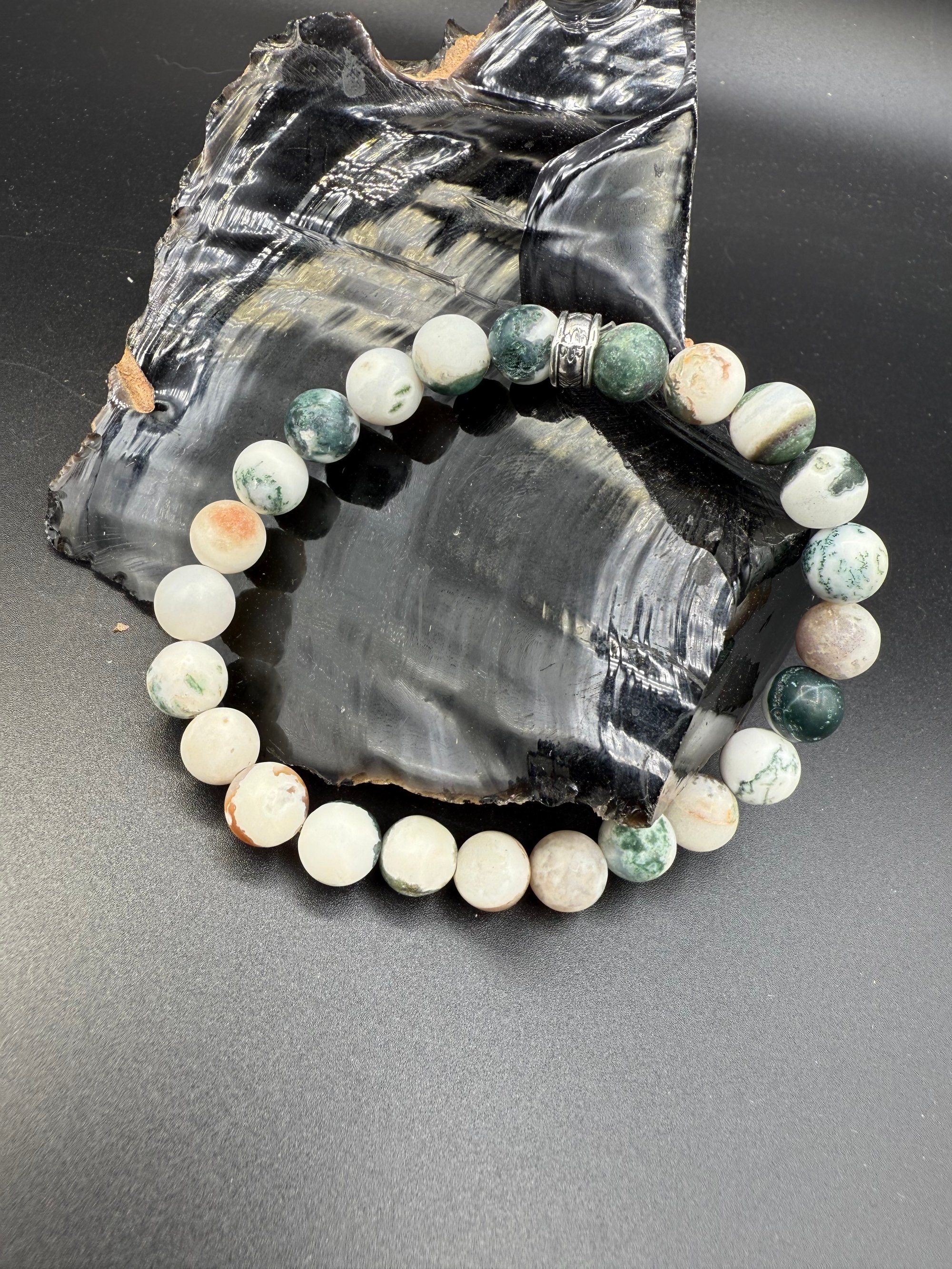 Here we have a beautiful white and green matte finish tree agate stretch bracelet. I love the soft colors on this. Tree agate is basically a moss agate, but instead of the typical agate color, that is replaced with a white agate. This bracelet is a size 7 inches.