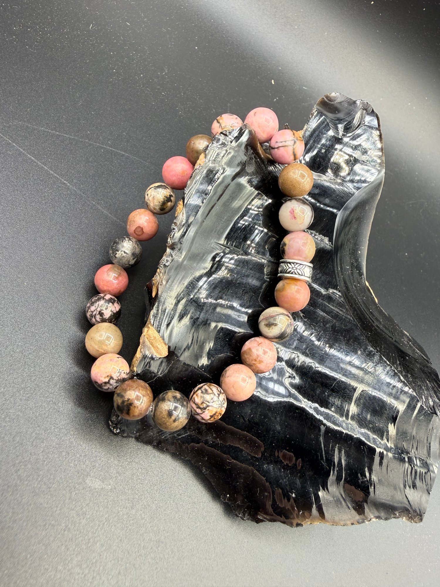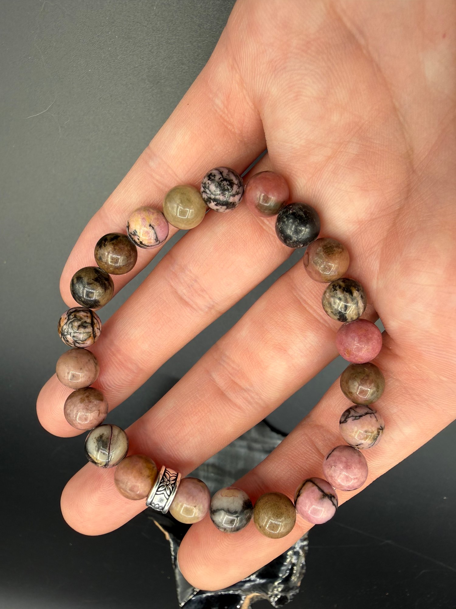 Here we have an 8 mm size rhodonite bracelet. The patterns on this are awesome! Also, there is a pretty good variation of all the colors on this one. I really love this material, such pretty colors! This bracelet is a size 6 1/2 inches.