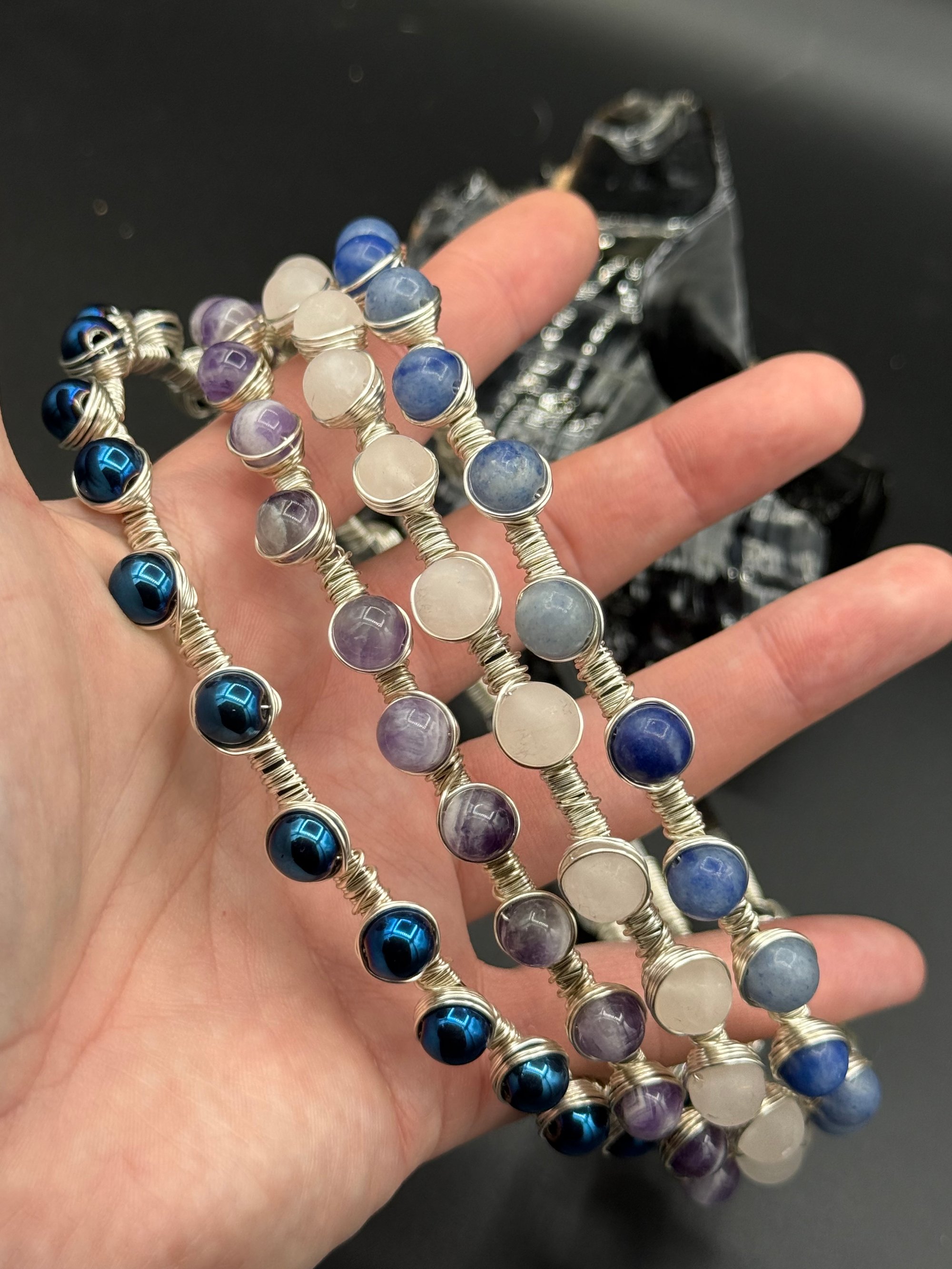 Right now I have titanium coated hematite, amethyst, rose quartz and blue aventurine.