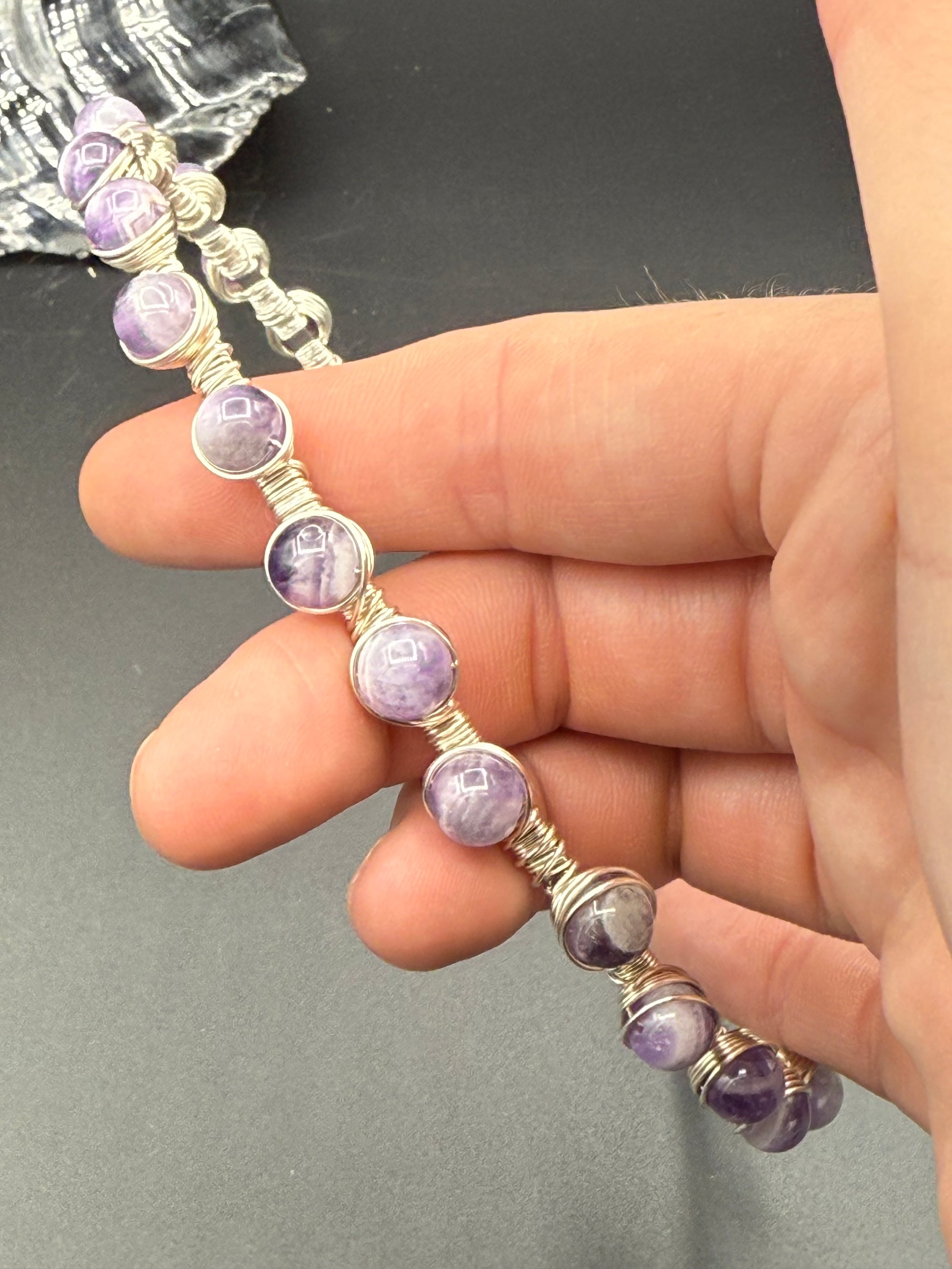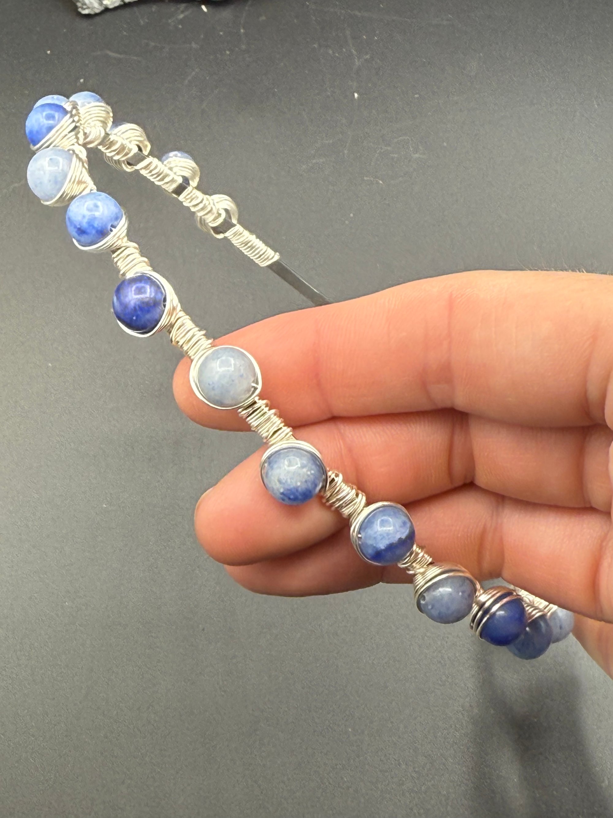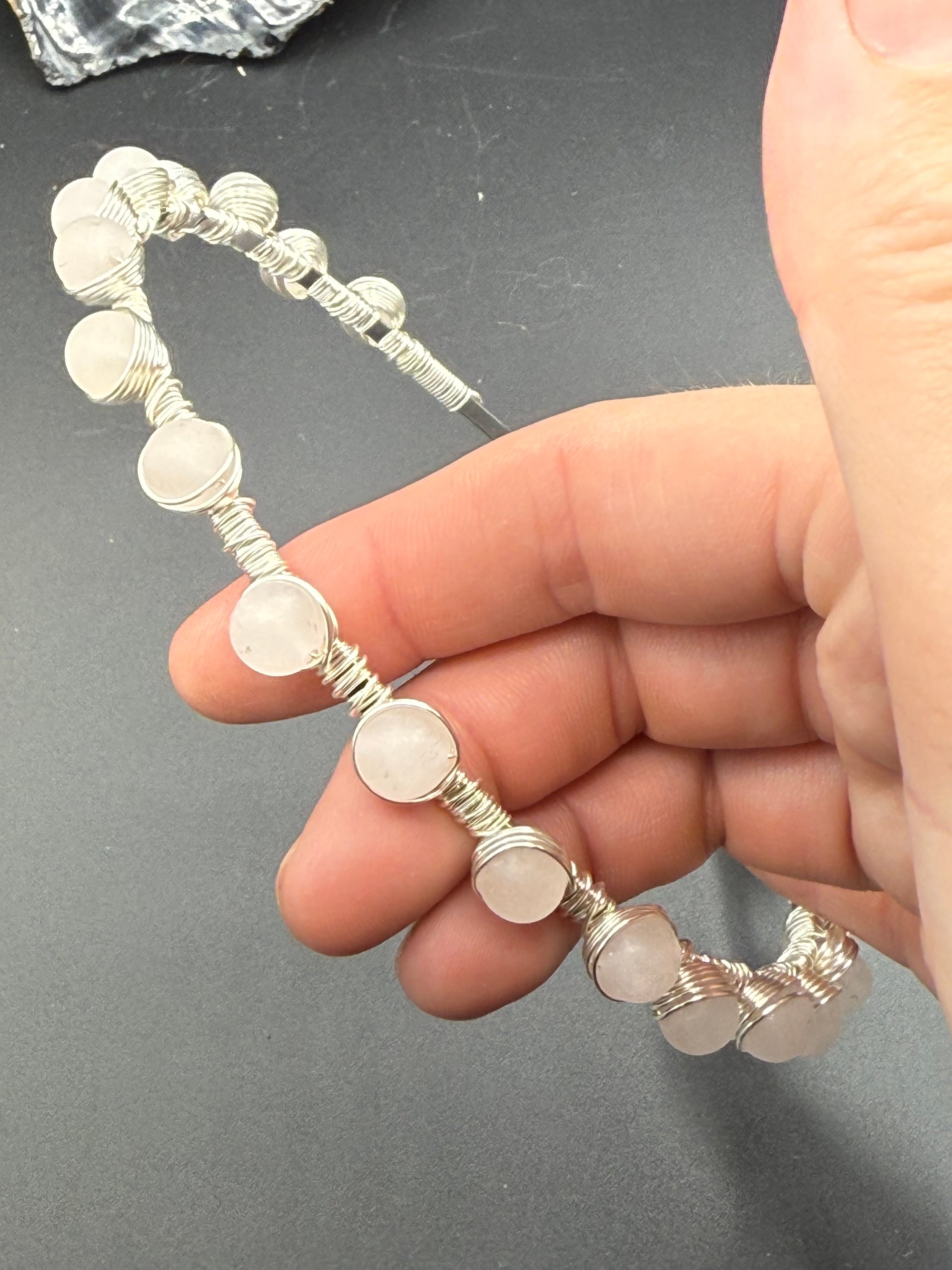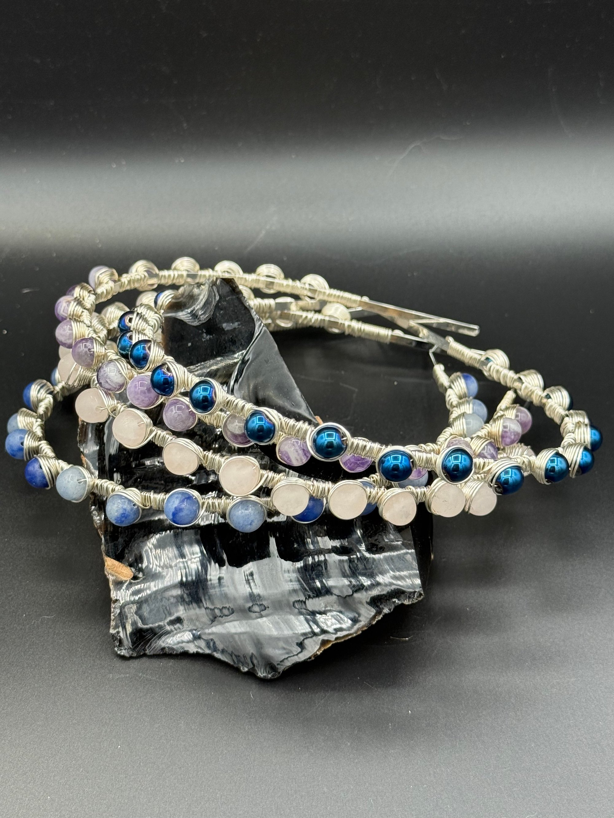 Here we have my take on beaded headbands. I have not seen any quite like this out in the wild, these are my original design. They are a headband base with the silver plated enameled non tarnish wire wrapped painstakingly around many times and around all of the beads. I have had many folks wear these and they tell me that their hair does not get stuck in them.