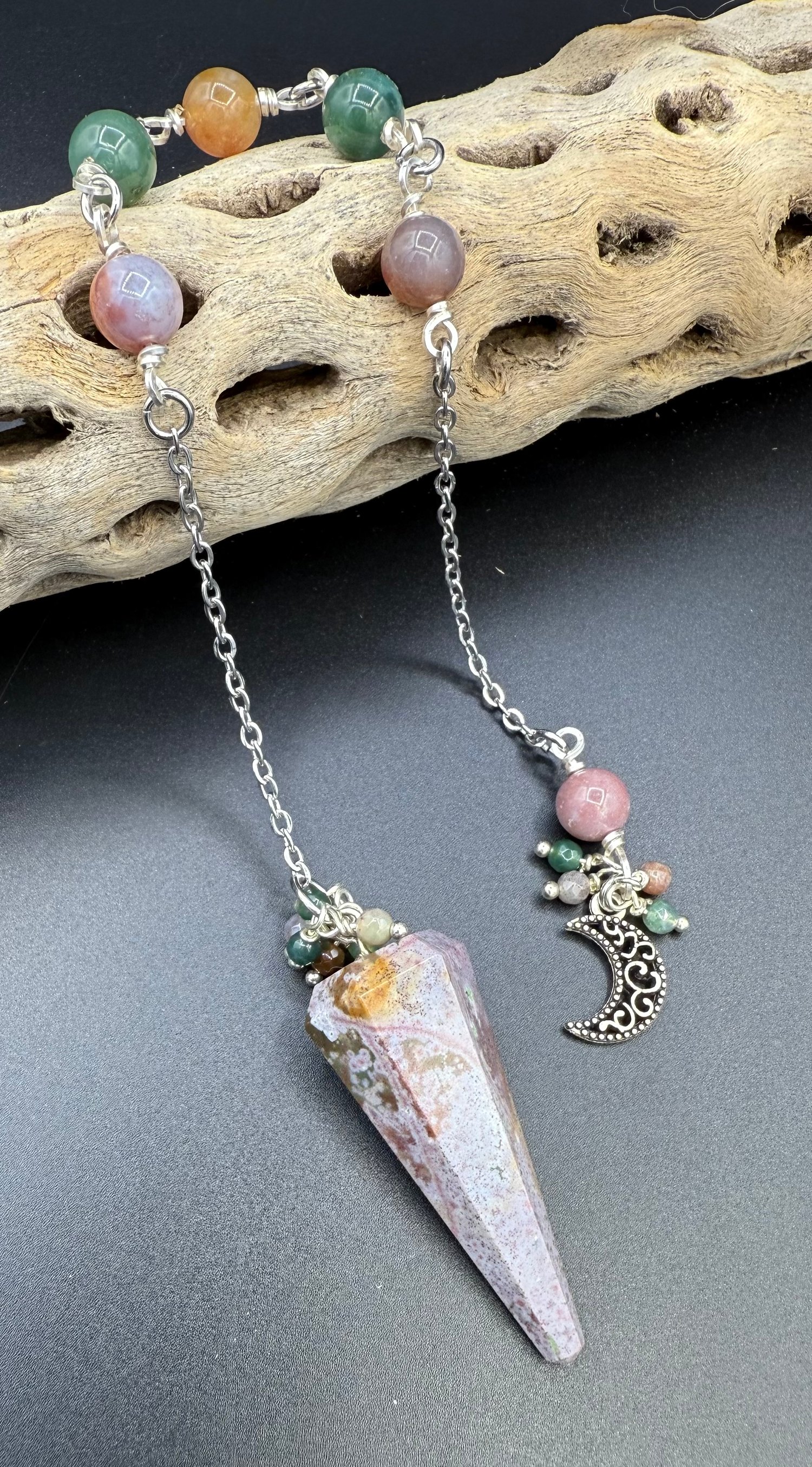 Here we have an indian agate pendulum, also known in some places as "fancy jasper", the patterns on which are exceedingly beautiful! I have never seen one quite like it. Look really closely and you can see all kinds of wonderful orbs in the patterns on the pendulum. This pendulum is paired with 8mm round and 3mm faceted indian agate beads, with a little moon charm at the end. Don't miss this one of a kind pendulum!