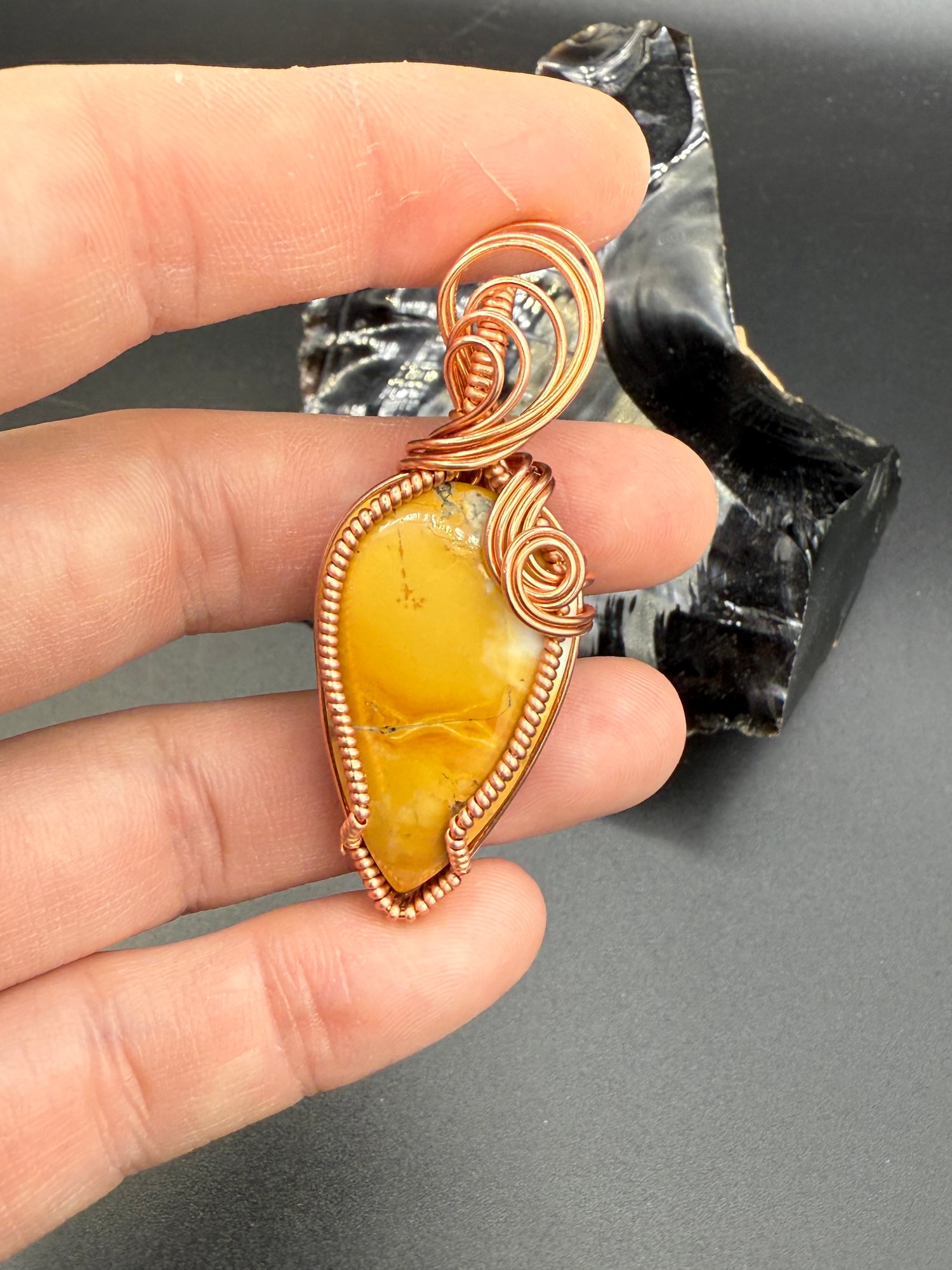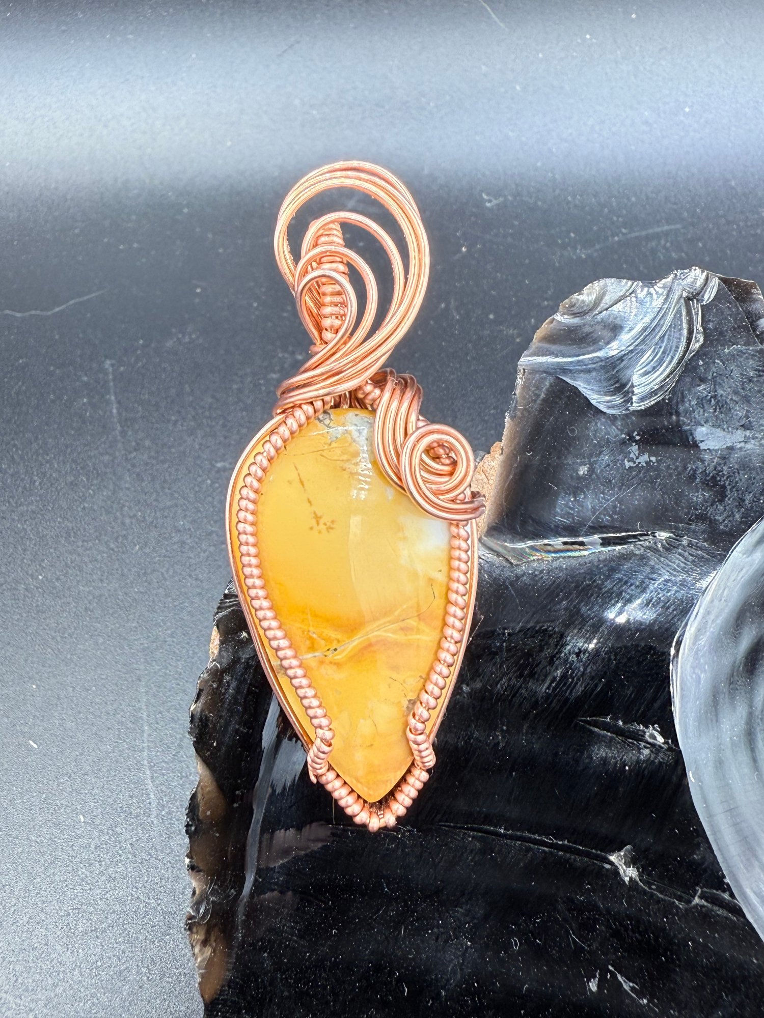 Here we have a lovely piece of Maligano Jasper. This material is one of my favorites because of the cool patterns you can see throughout and the variations of color. This one is mostly yellow with a bit of interesting pattern right in the middle. I wrapped it in bare copper to complement the yellow stone. It will come with a 24 inch copper plated chain.