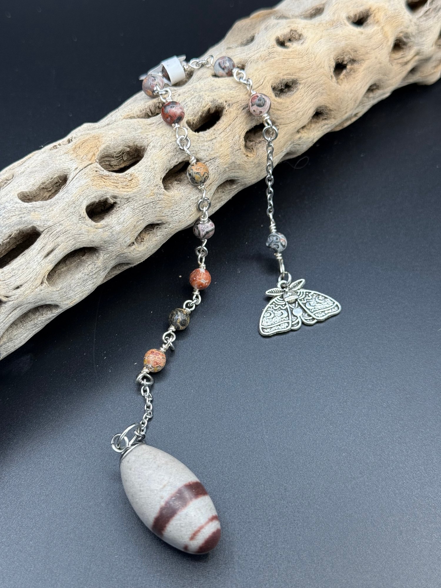 The Narmada stone, sometimes called a shiva lingam stone, comes from India in the Narmada river. This pendulum is its natural tumbled form, and has been paired with some 6mm old stock leopardskin jasper. These are beads that are very old, and you don't typically find leopardskin jasper this nice anymore. At the end of this pendulum chain is a cute lunar moth. All my pendulums are made with high quality stainless steel chain.