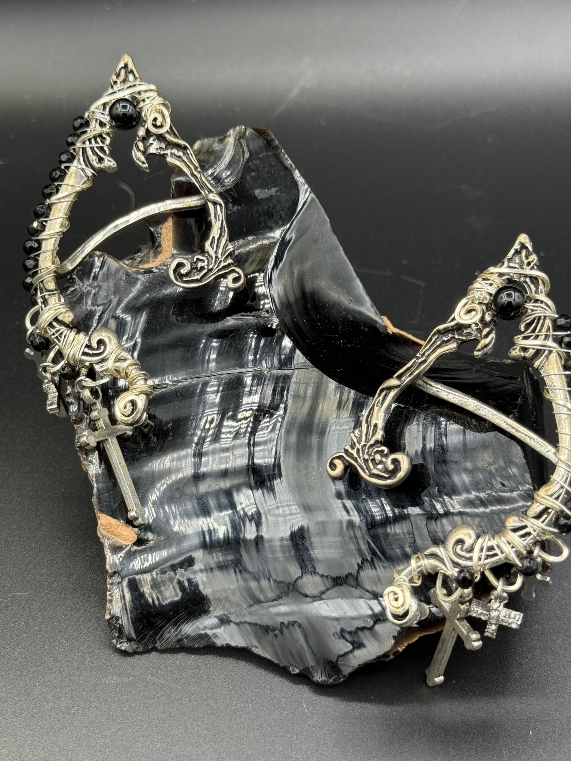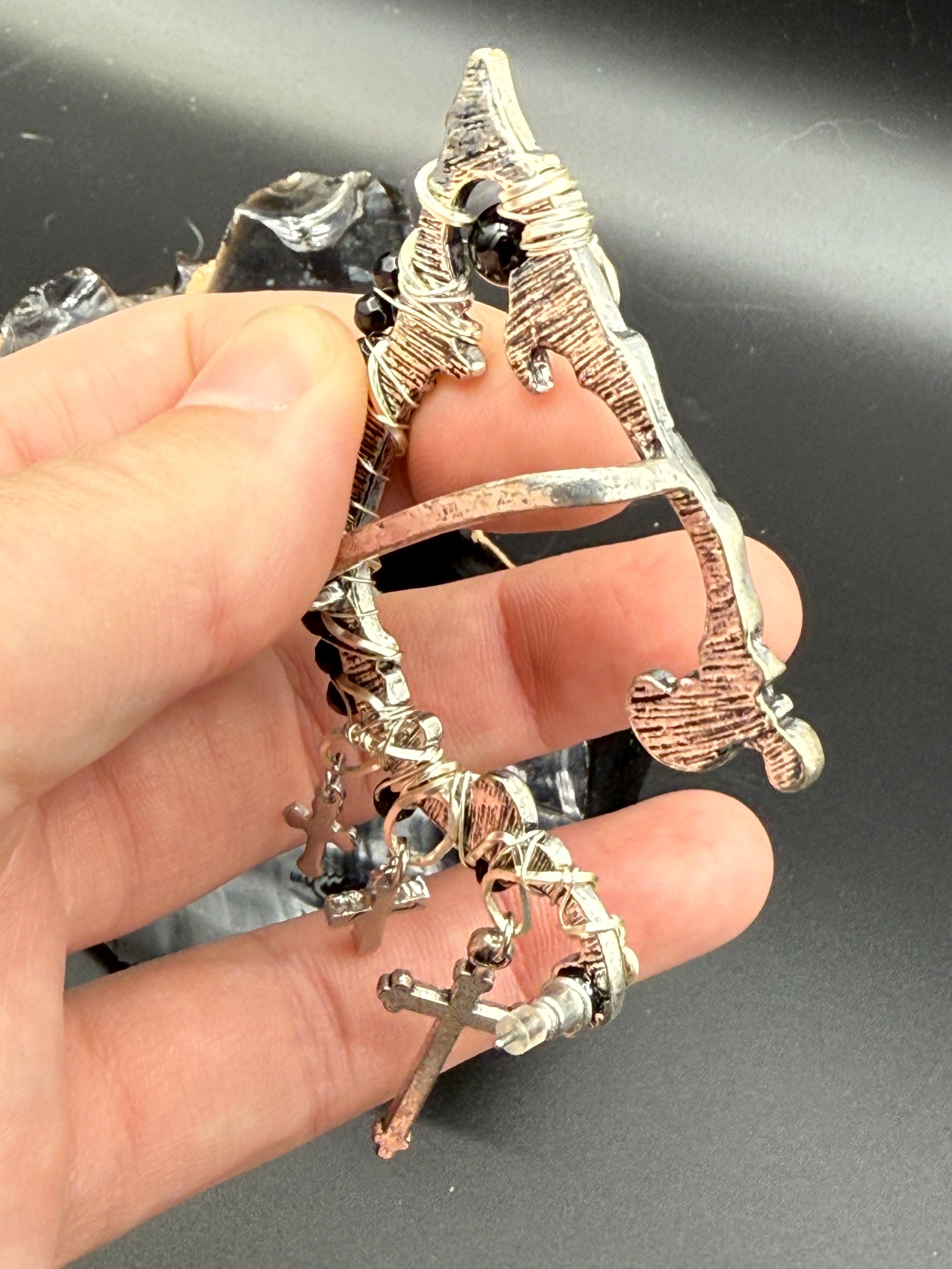 These are my last pair of these! These are some elf earcuff earrings that I’ve made with onyx and cross charms. It mostly bas very small onyx beads, but also one 6mm onyx bead on each one. The way these are worn is it takes one earlobe piercing and the bar on the back goes over the top of your ear. Its easier if you have several holes in each earlobe, if you put it into the highest hole. These are also sized for your average woman’s ears so they are somewhat small.