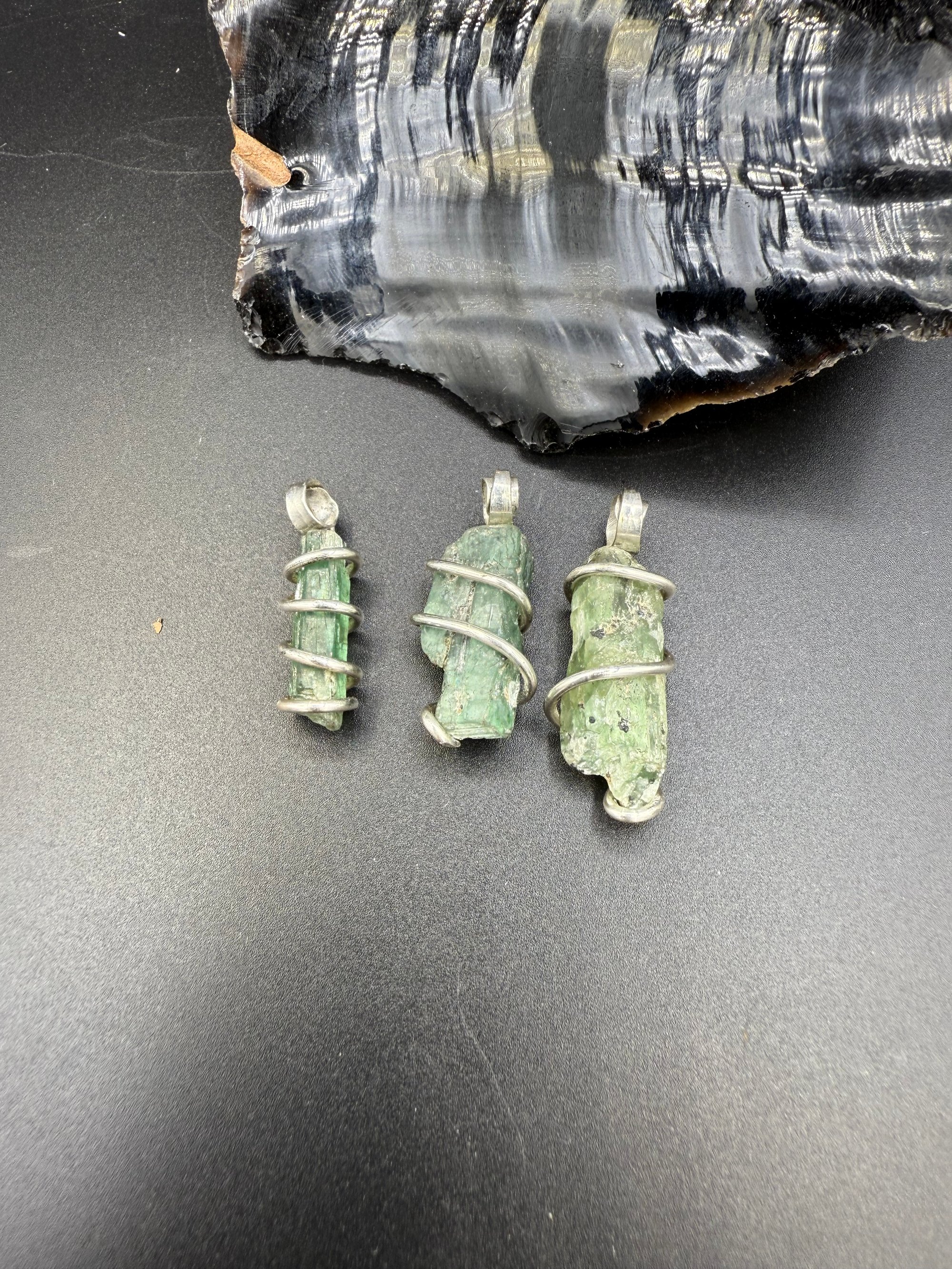 Here we have some Sterling wrapped green kyanite pieces. I’m using the last of my sterling because the price of sterling has shot up so high I won’t be able to buy any more. You can select A, B, or C, and they are in the order on the photograph. These are raw pieces of green kyanite wrapped in round sterling silver wire.