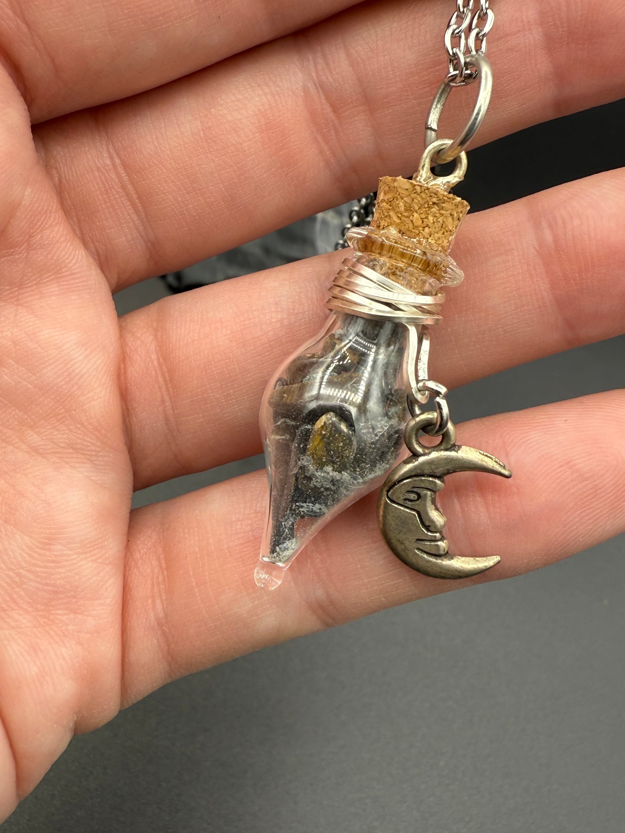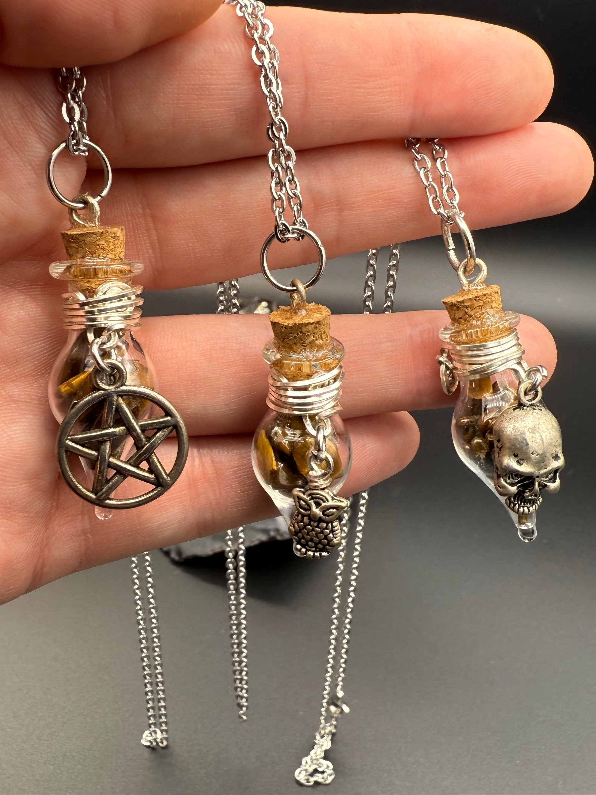 Here we have some more bottle necklaces with charms. These ones are yellow tiger-eye chips. There is ONE blue tigers eye, in which I had to painstakingly pick the rare blue ones out of a giant bag of yellow ones. The bottles each have different charms hanging off wire I have wrapped around them. These bottle necklaces have cork tops that are glued in, so please be gentle with them.