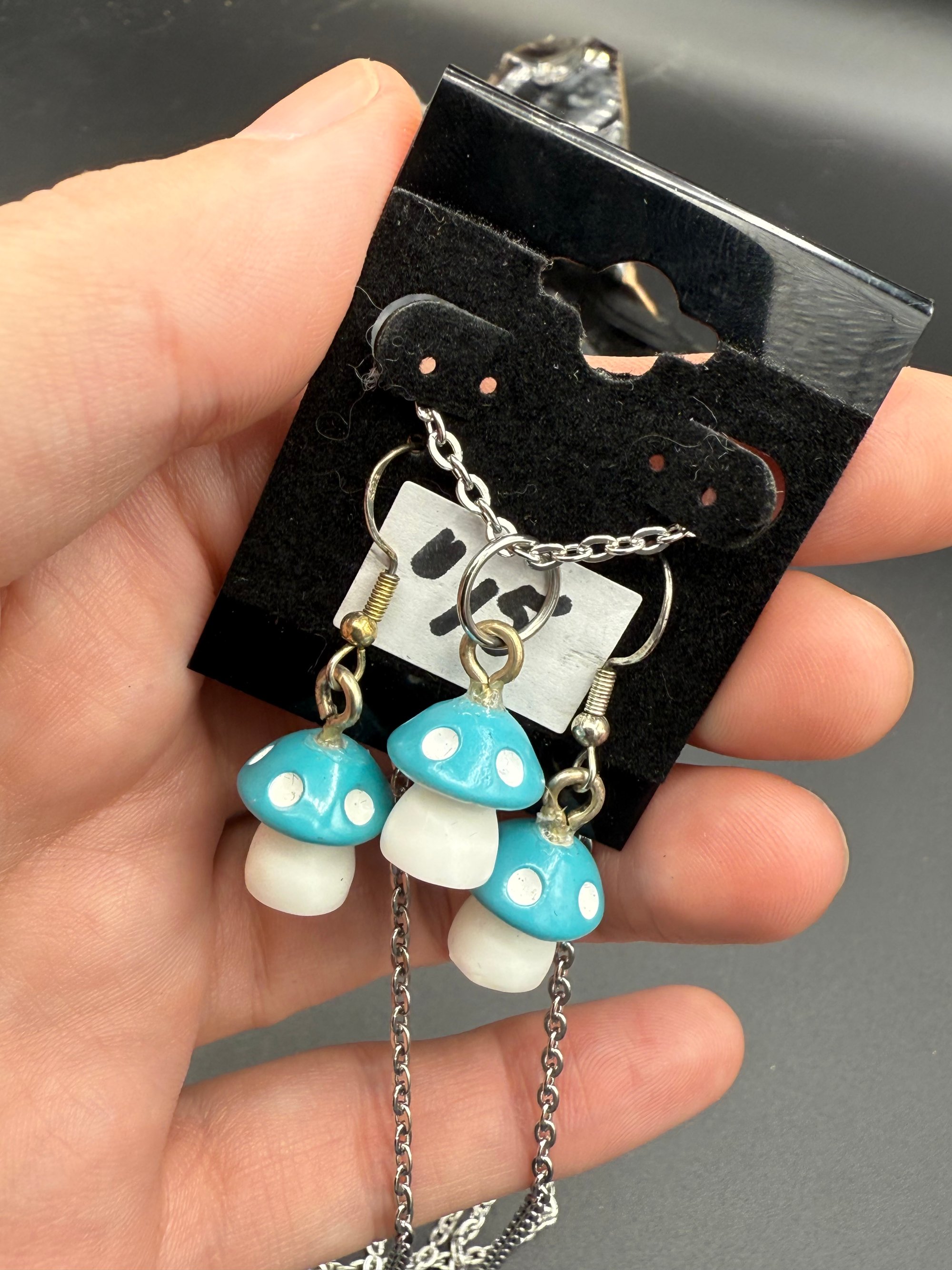 These little mushroom guys are already mounted on plastic backs that hang from this little spinny thing I take with me to vending events. But I thought it would be fun to list them here on the site so more people see how cute they are. I only have 4 sets of these. I am told you can buy them with the loops already attached, but nobody told me that before so I stupidly sat there and drilled tiny holes in each one by hand to put them in there. Made with love and frustration!